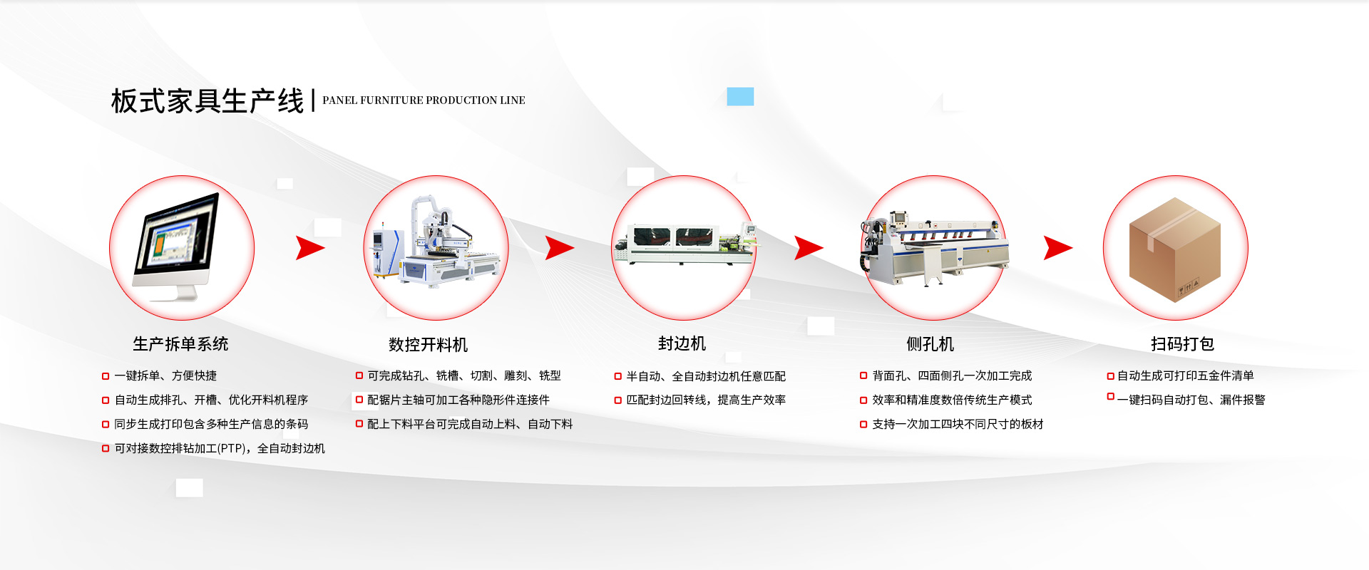 板式家具生產(chǎn)線是目前各大家具廠中常用的設備加工方式,它是由數(shù)控開料機、封邊機、數(shù)控鉆孔設備、拋光機、覆膜機、精密鋸、雙頭鉸鏈鉆組合而成一套完整的生產(chǎn)線... 閱讀詳情 >>